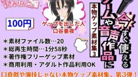 きみりんこ。 ゲームや音声作品に今すぐ使える!〜本物ゲップ素材集3〜 【きみりんこ。】 人気同人サークル「きみりんこ。」のエロ同人・エロ漫画 著作権フリー「女性の本物のゲップ」素材集第3弾です。 収録中に出たゲップを録り溜めたもので、口真似や演技ではありません。 台詞は一切なく、ゲップの音だけの素材です。 20のみストーリー形... 2026.03.06 きみりんこ。